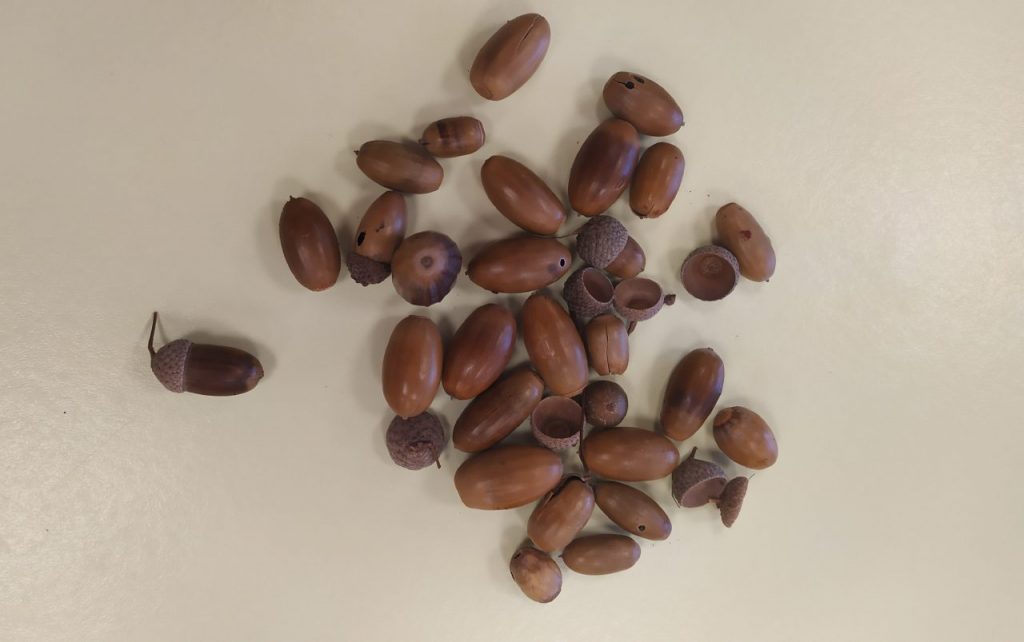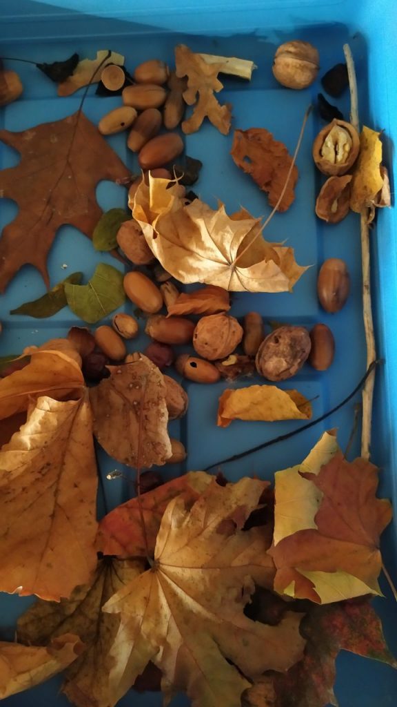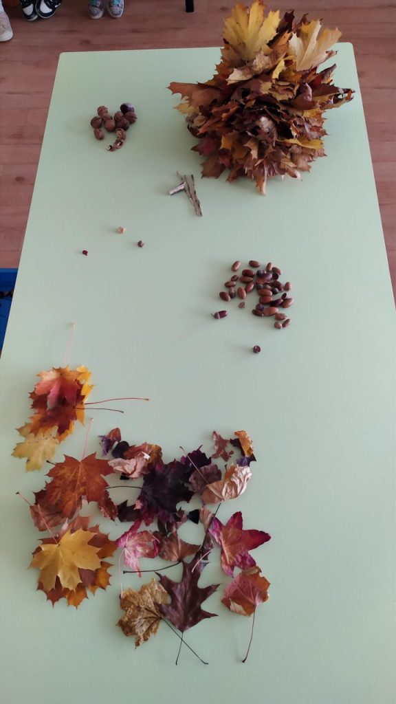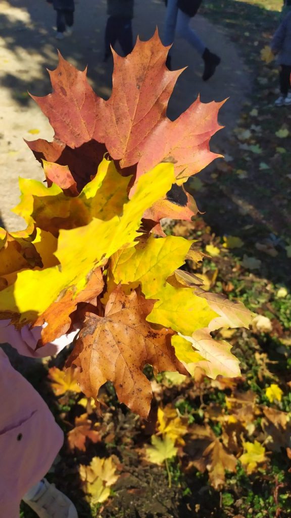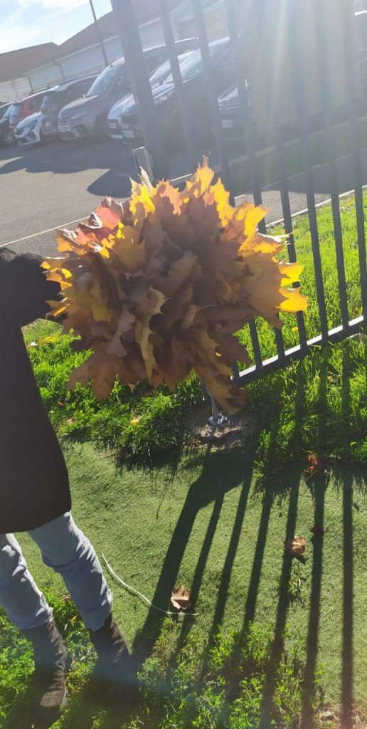 Dans les classes maternelles, nous avons observé les feuilles des arbres. Elles sont de différentes couleurs : jaunes, vertes, rouges, oranges ou marron. Elles ont des formes variées. Le vent fait bouger les feuilles des arbres. Il caresse notre visage et soulève nos cheveux. Nous avons fait un bouquet de feuilles. Les élèves ont trouvé des trésors d’automne en se promenant pendant les vacances : des bois, des cailloux, des glands, des marrons, des noix….